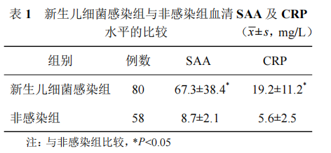 检验医学2016年发表:《血清淀粉样蛋白A与C反应蛋白联合检测在新生儿细菌感染诊断中的应用》。主要为研究血清淀粉样蛋白A(SAA)和C反应蛋白(CRP)以及白细胞总数在新生儿细菌感染诊断中的应用价值。分别检测80例细菌感染新生儿及58名体检正常的新生儿(非感染组)SAA、CRP和白细胞总数并做比较。