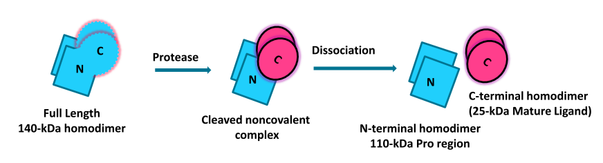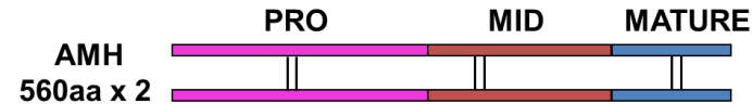 AMH在胞质转运前会分裂产生110-kDa N-端和25-kDa C-端两个二聚体,在血液循环中,N-端和C-端二聚体会连成一个非共价复合物(Cleaved noncovalent complex)。研究发现AMH的C-端二聚体活性远少于非共价复合物,但添加N-端的PRO区域后可恢复几乎全部活性。全长的AMH复合物(140-kD homodimer)在血液循环中占10%以下,且活性很低。非共价复合物是AMH主要的存在形式,且活性最高。AMH非共价复合物由2条560aa通过二硫键连接,分为PRO、MID和MATURE三个部分。