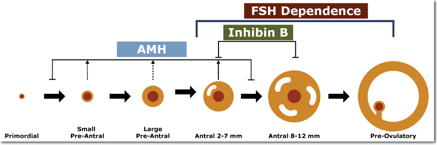 AMH可调控起始募集(卵泡从静止状态被募集进入生长池)和循环募集(生长卵泡被选择继续生长直到排卵前阶段),抑制原始卵泡池过快消耗及优势卵泡形成。在次级卵泡招募之前的早期卵泡发育在很大程度上不依赖促性腺激素。从而在正常月经周期的卵泡晚期AMH血清水平不受优势卵泡生长的影响。这使得AMH便于临床使用,与当前可用的卵巢老化的其他标记物不同,如抑制素B、雌二醇(E2)和FSH,这些标志物均依赖于月经周期,并且这些标志物是原始卵泡池耗竭过程的晚期标志物。在循环募集阶段,AMH可通过降低卵泡对FSH的敏感性来抑制FSH诱导的卵泡生长。血清AMH水平不受垂体促性腺激素的影响,在整个月经周期中数值变化不大。