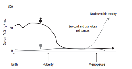 在缺乏AMH的情况下,胚胎将发育成雌性,缪勒管分化成阴道上段、子宫和输卵管。在胎儿后期,AMH由驻留在卵泡内的颗粒细胞合成。AMH在窦前卵泡和小窦状卵泡中表达最强,随着卵泡的增大,AMH表达逐渐减少。妊娠36周后女性胎儿的卵巢颗粒细胞开始分泌微量AMH,出生后维持极低水平,随着人体的成熟逐渐增加,到性成熟达最高水平,此后随着年龄增长而下降,绝经后消失。