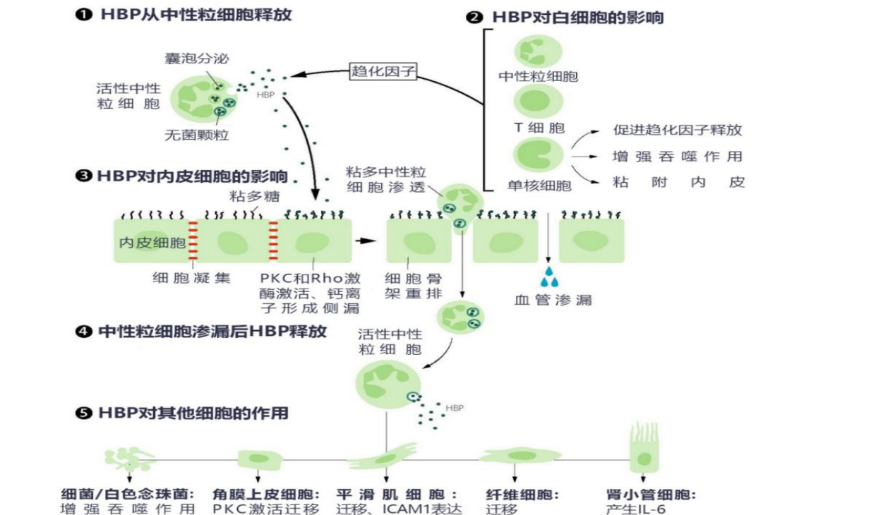 HBP可引起血管渗漏和组织水肿,其作为致病因子,是肝素、白蛋白等药物治疗脓毒症的潜在靶点。
