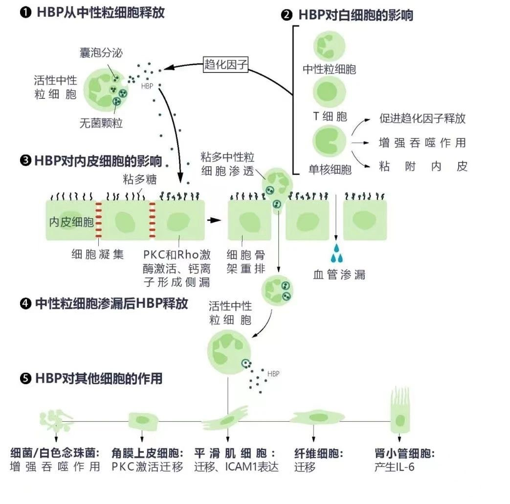 HBP影响血管内皮通透性:HBP是具有促炎特性和诱导血管高通透性能力的中性粒细胞来源的颗粒蛋白,尤其在提高血管内皮通透性方面发挥着重要作用。